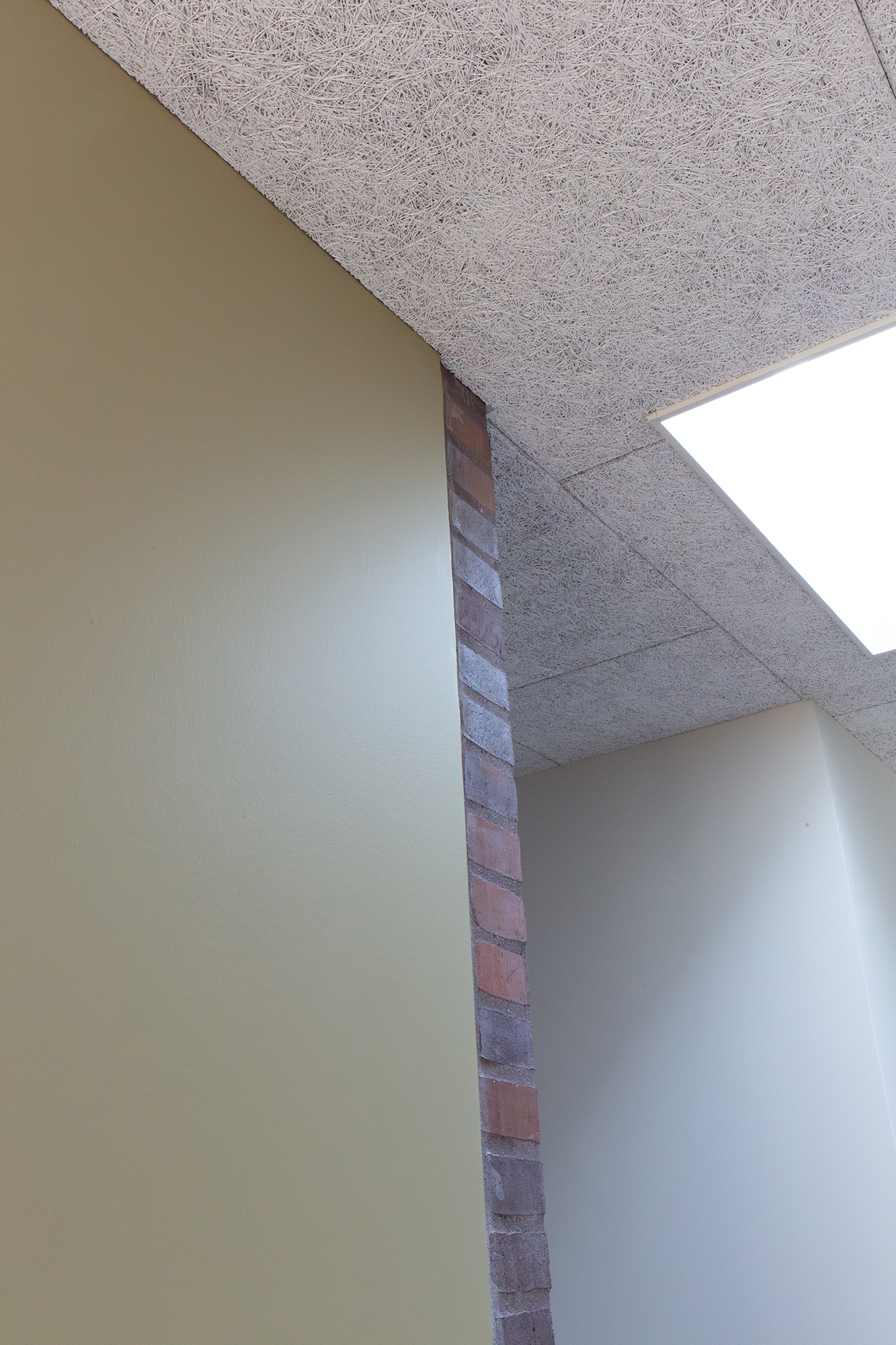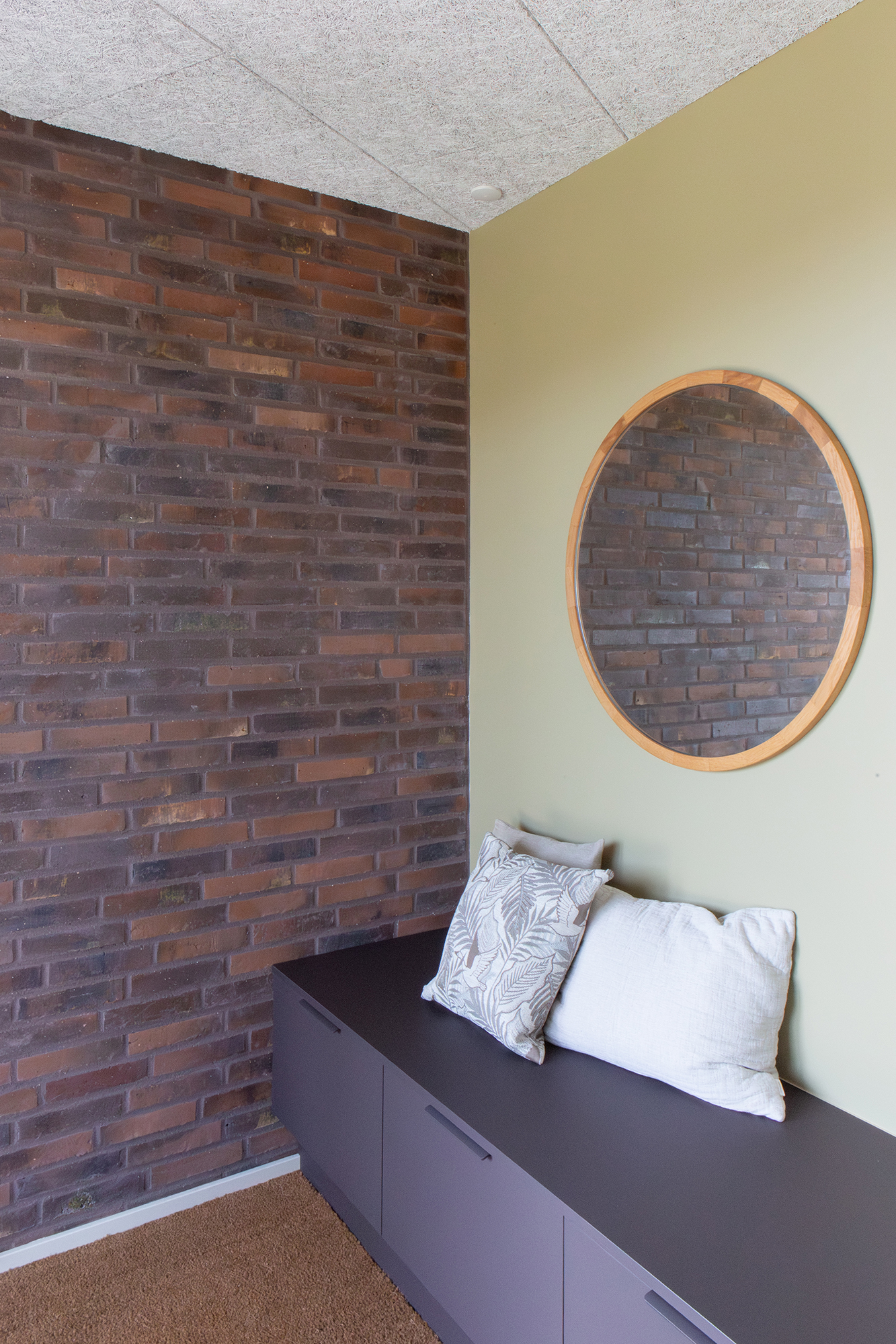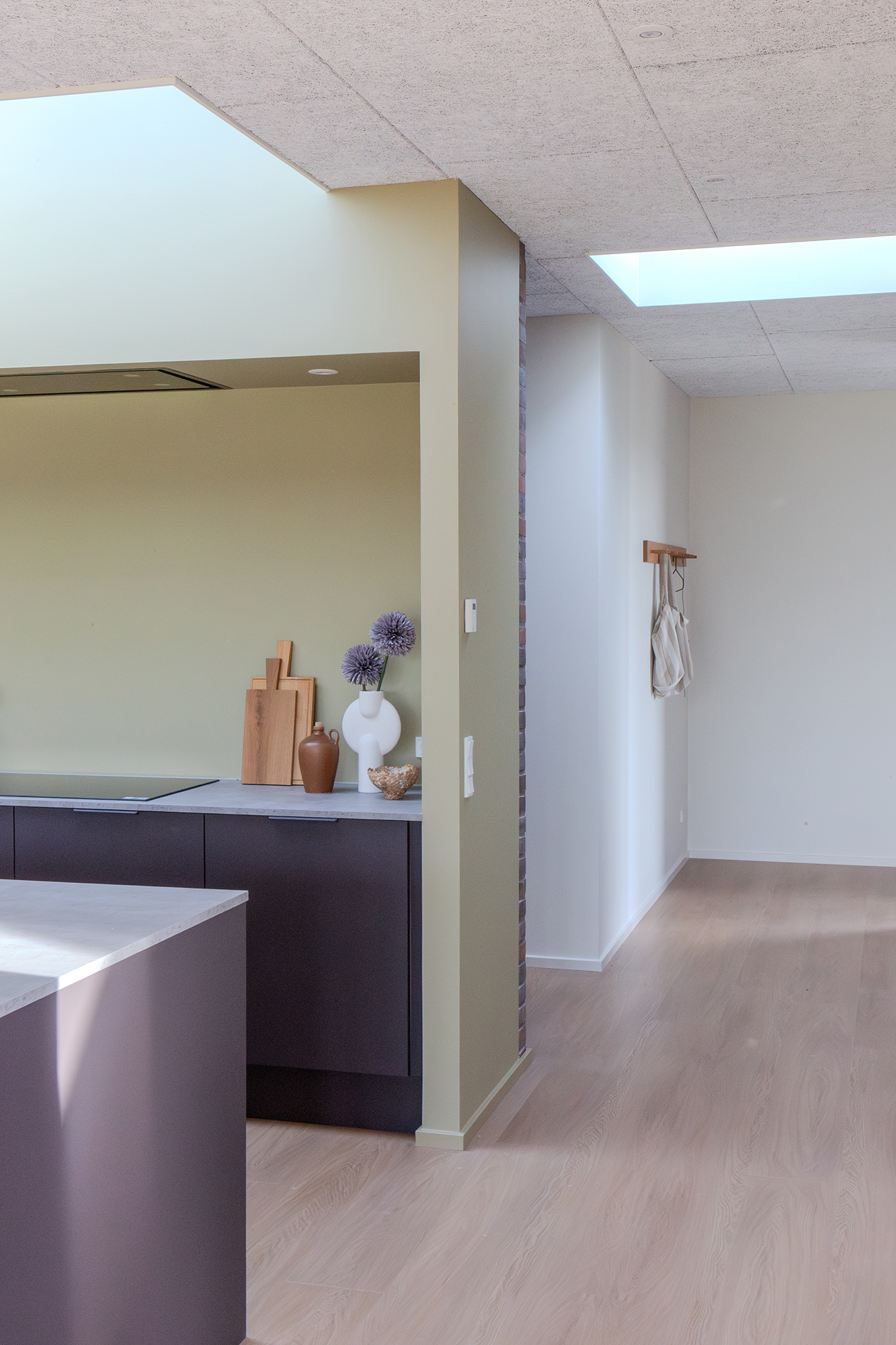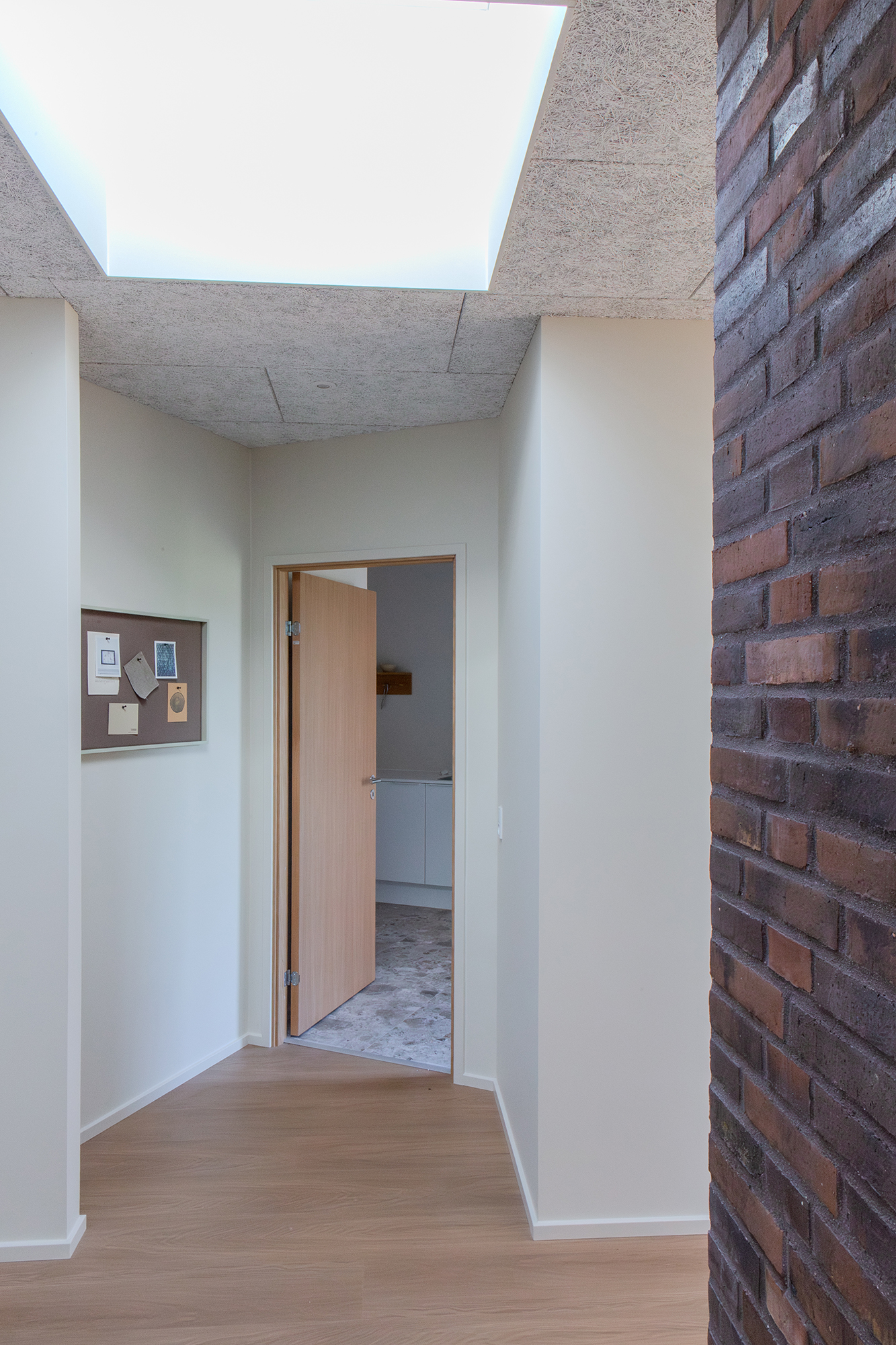 Den imponerende centrale gang bag køkkennichen fungerer som husets rygrad med den karakteristiske murstensvæg som markant visuelt element. Gangen skaber naturligt flow mellem husets rum.