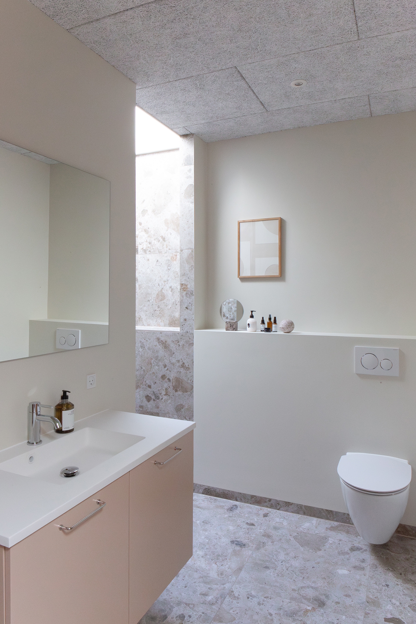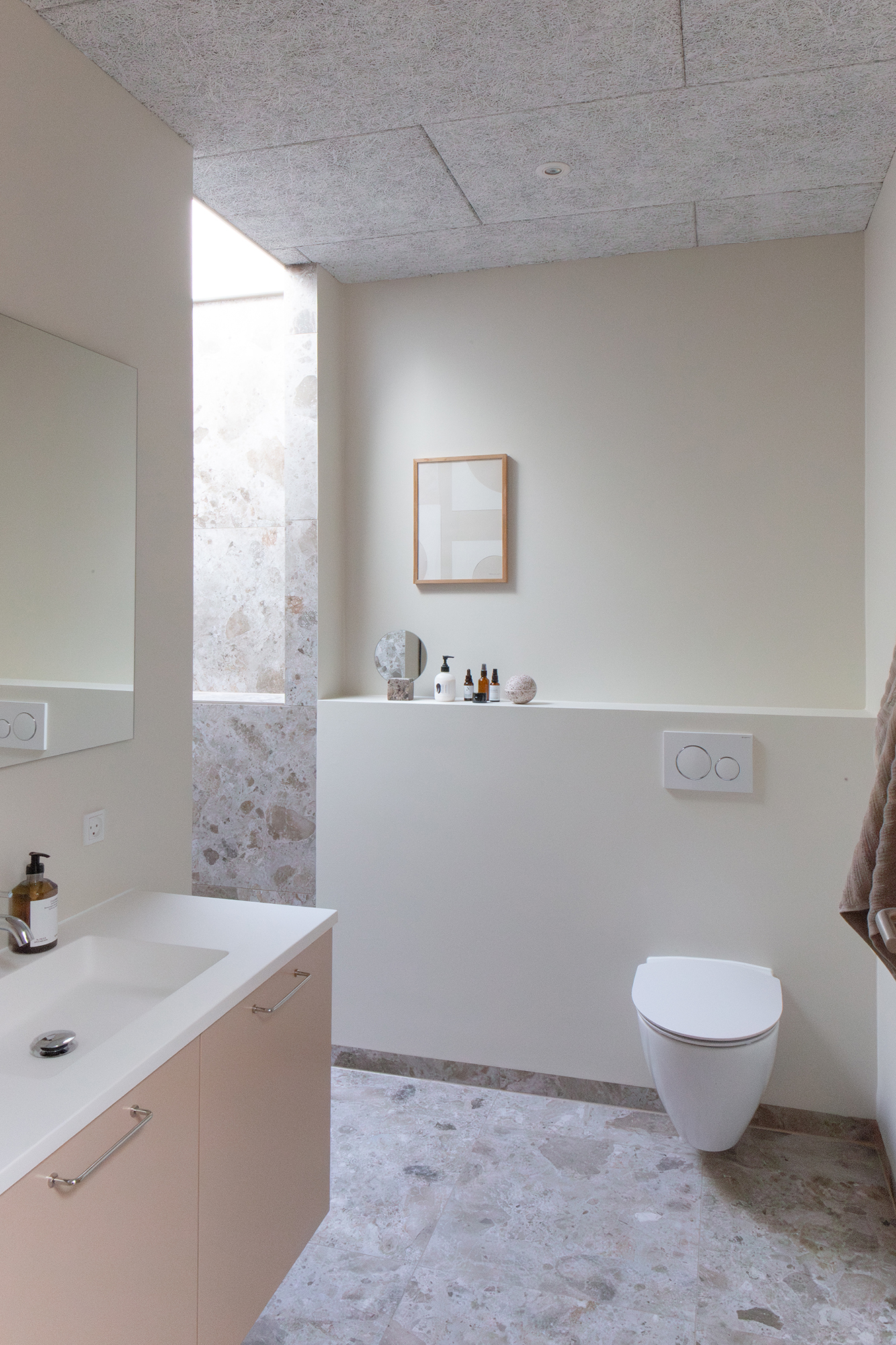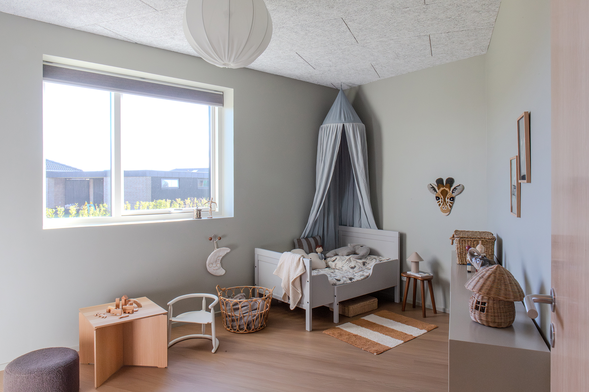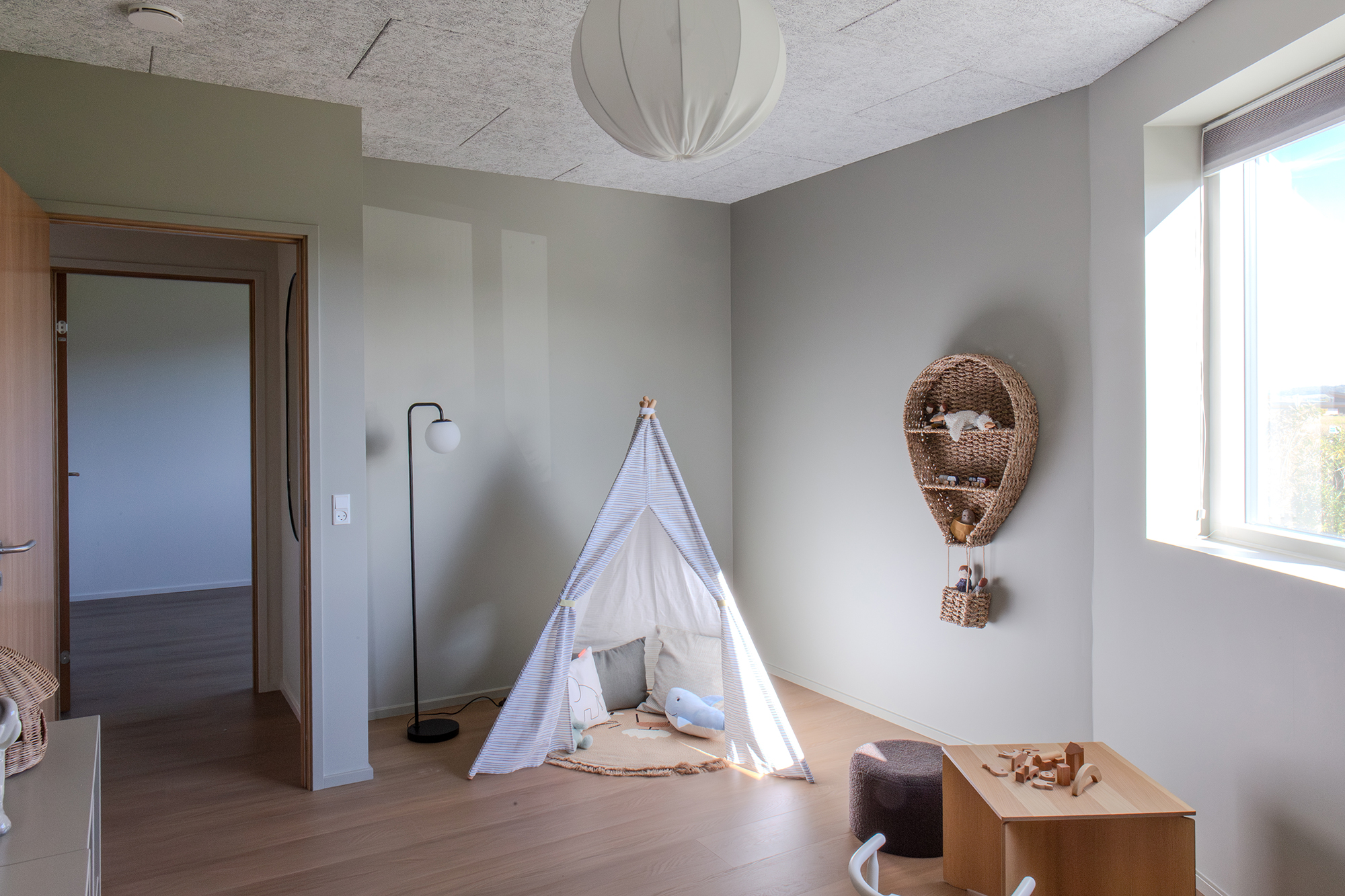 I det nordøstlige hjørne finder du kontoret og et skønt badeværelse, hvor en dyb bruseniche gemmer sig på den anden side af vægspejlet og håndvasken, badet i naturligt lys fra ovenlysvinduet. Du finder også de to børneværelser på 14,5 og 11,5 m² med de større vinduer, der fylder rummene med dagens skiftende lys.