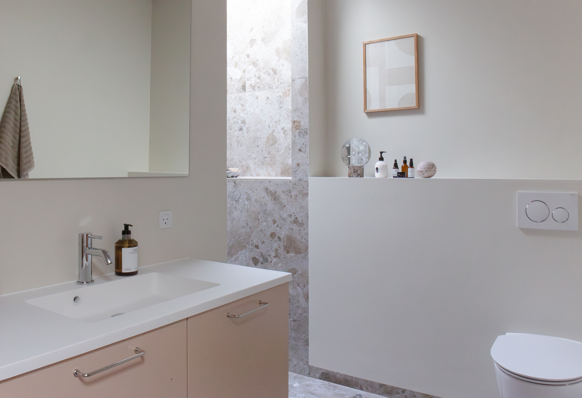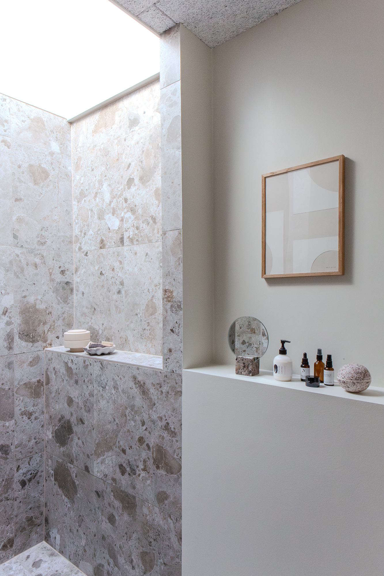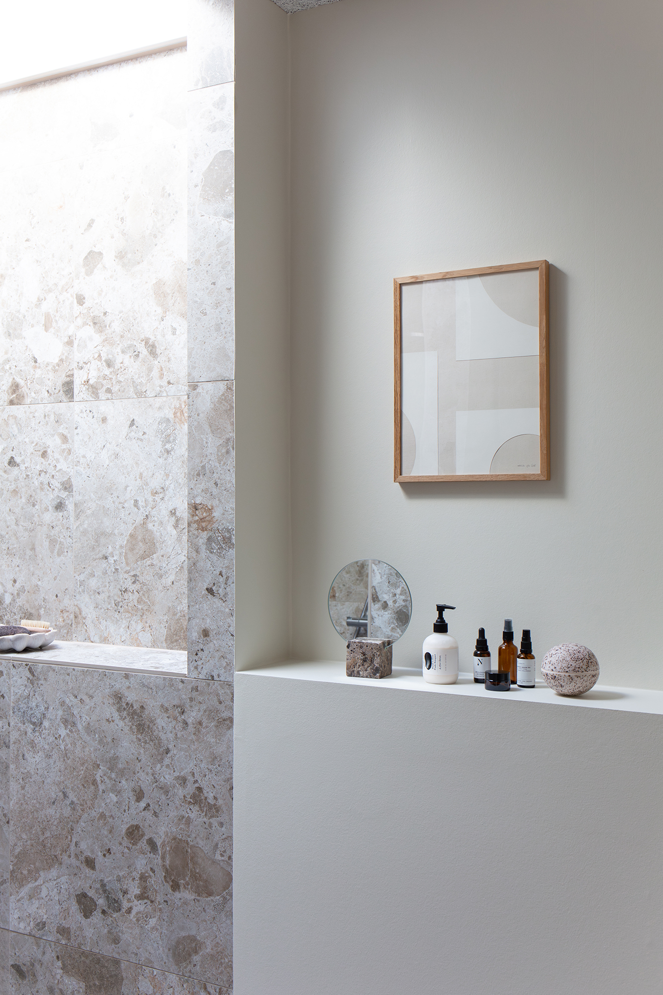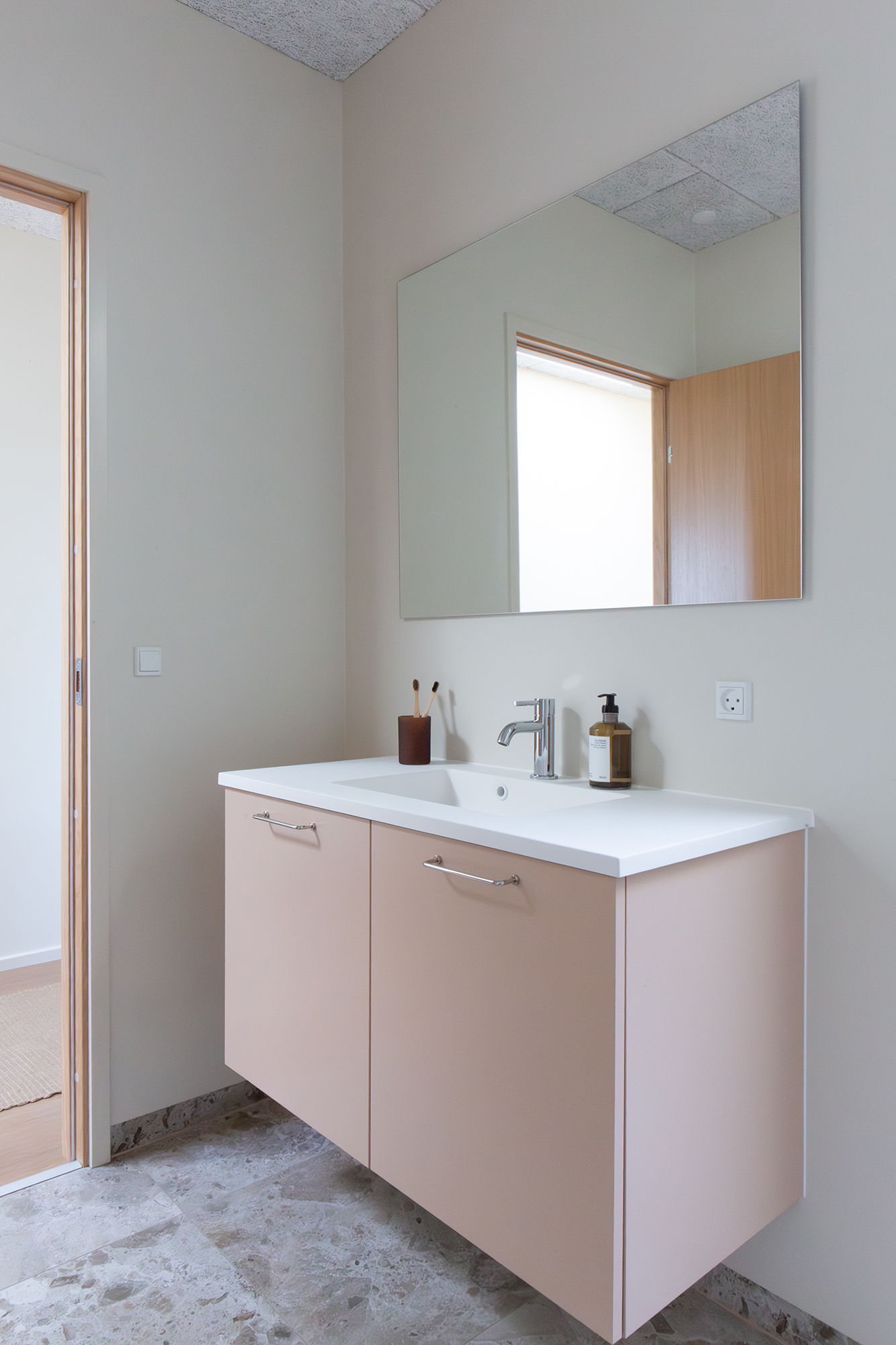 I det nordøstlige hjørne finder du kontoret og et skønt badeværelse, hvor en dyb bruseniche gemmer sig på den anden side af vægspejlet og håndvasken, badet i naturligt lys fra ovenlysvinduet. Du finder også de to børneværelser på 14,5 og 11,5 m² med de større vinduer, der fylder rummene med dagens skiftende lys.