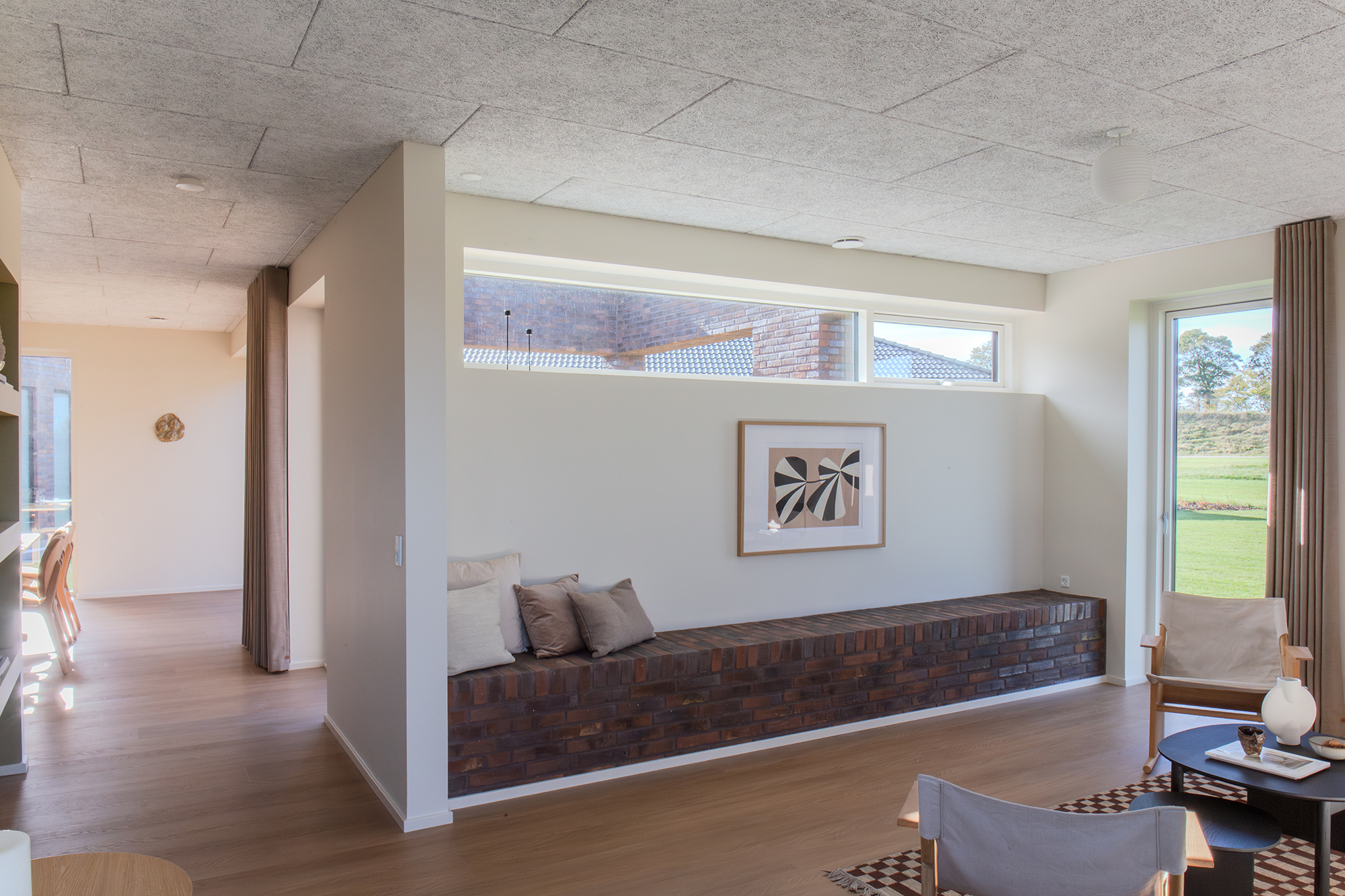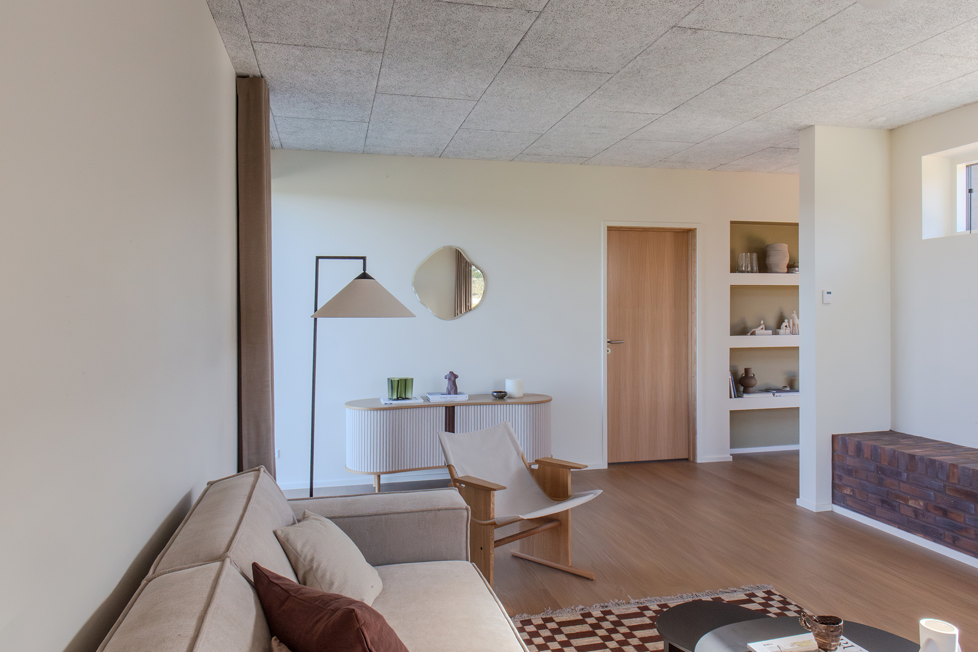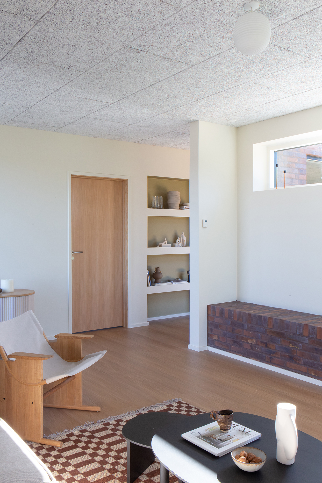 Tilbage i køkken-alrummet fører en charmerende passage med indbyggede hylder videre til stuen på 23 m². Det højtsiddende vindue med murstensbænken skaber det perfekte sted til fordybelse – en fredelig oase, når køkkenet summer af liv.