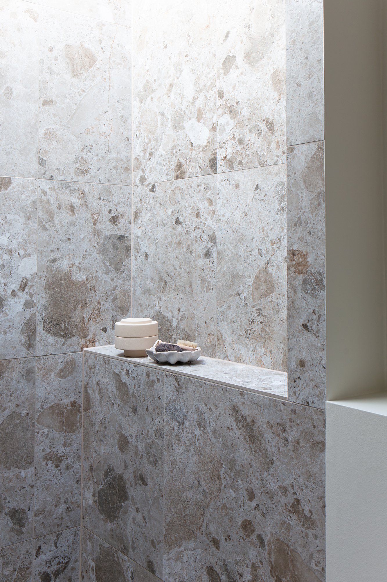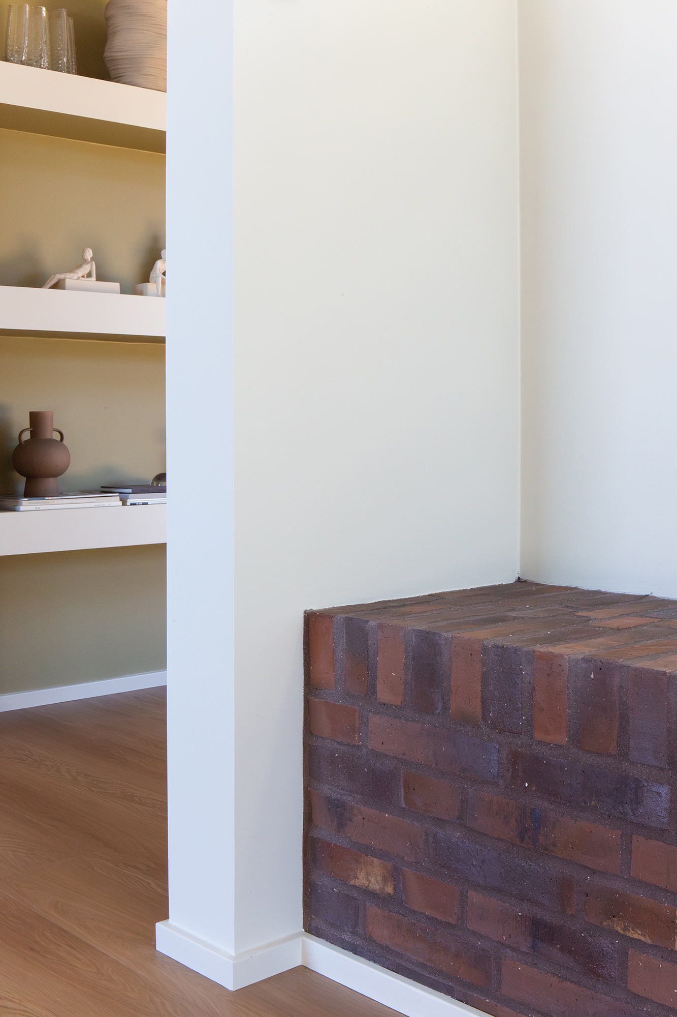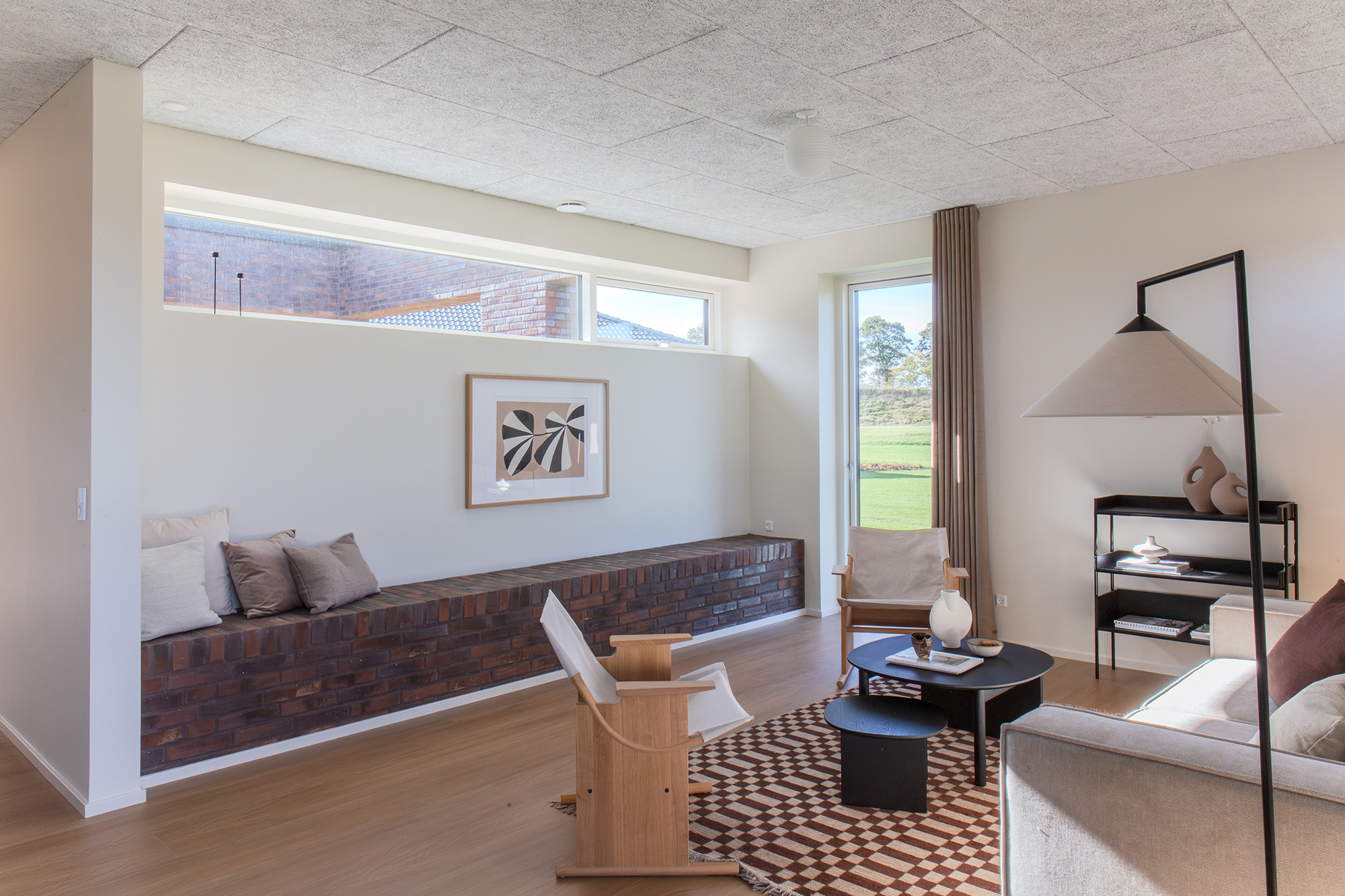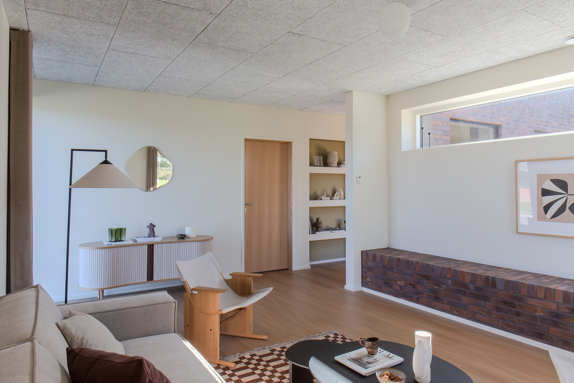 Tilbage i køkken-alrummet fører en charmerende passage med indbyggede hylder videre til stuen på 23 m². Det højtsiddende vindue med murstensbænken skaber det perfekte sted til fordybelse – en fredelig oase, når køkkenet summer af liv.