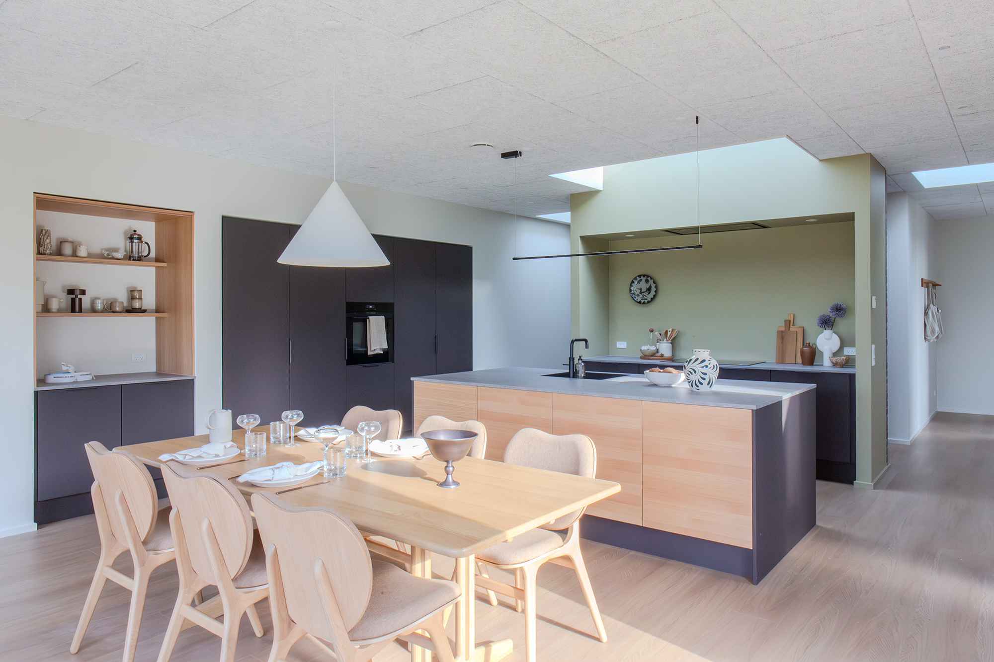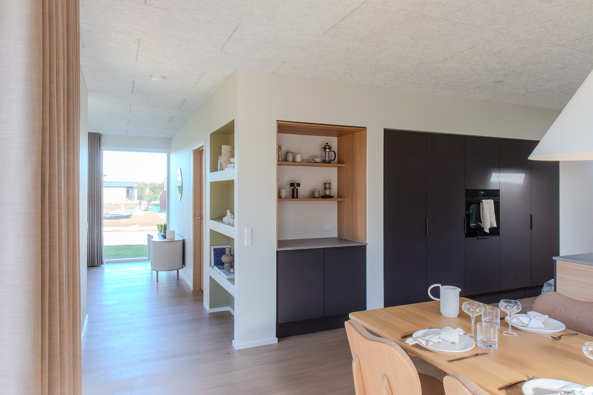 Videre ind åbenbarer husets sande magi sig: det åbne køkken-alrum på hele 37 m², hvor køkkenøen bliver familiens naturlige samlingspunkt. Her blander duften af morgenkaffe fra den indbyggede kaffeniche sig med børnenes latter, mens det skjulte depot på 2,5 m² diskret kan rumme alt fra krea-kassen, familiens spil og køkkenessentials.